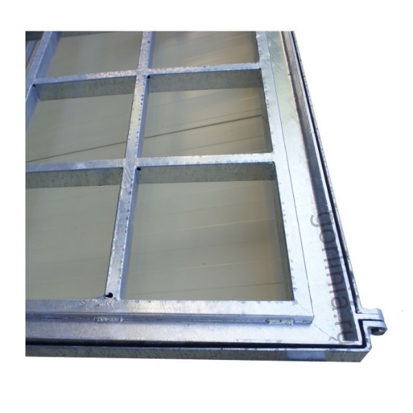 Рама сварена из сортового уголка 50х5. Каркас двери с видимым кантом выполнен с обвязкой из профиля 50х25 с ячейкой 300х300 в осях. Дно крышки закрыто оцинкованным листом 2 мм с расчетной глубиной 20 или 30 мм в зависимости от толщины доски декинга. Элемент петли реализован выносными разъемными шарнирами.