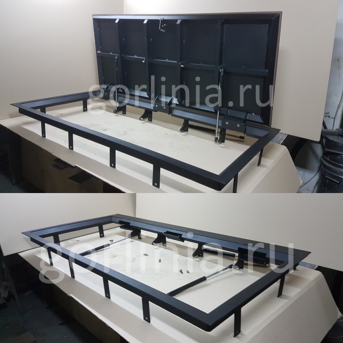 Объемное соединение уголков 63х40 и 40х40 в раме многократно увеличивает несущую способность крышки в гараже. Дверца в обвязке из уголка 40х40, профиля 50х25, 30х30 обшита металлическим листом «чечевица» толщиной 3 мм, окрашена порошковой эмалью.