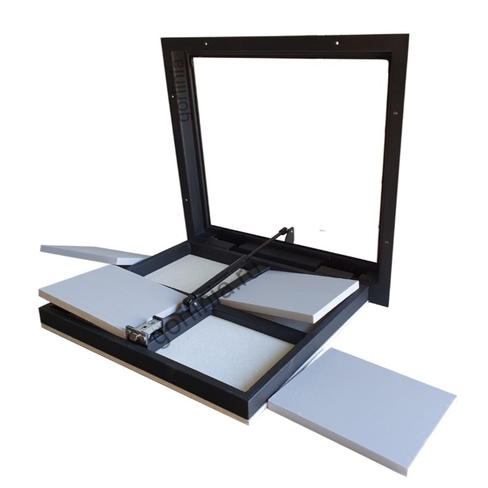 Облегченная модель с утеплителем 20 мм в дверце без щелей в полу, смещенными за ось открывания петлями. Легкая ходовая часть и удобная установка с наличником. Заполнение крышки - гипсоволокнистый влагостойкий лист, выставлен в уровень внешней полки рамы под наклейку плитки или ламината.