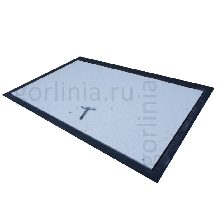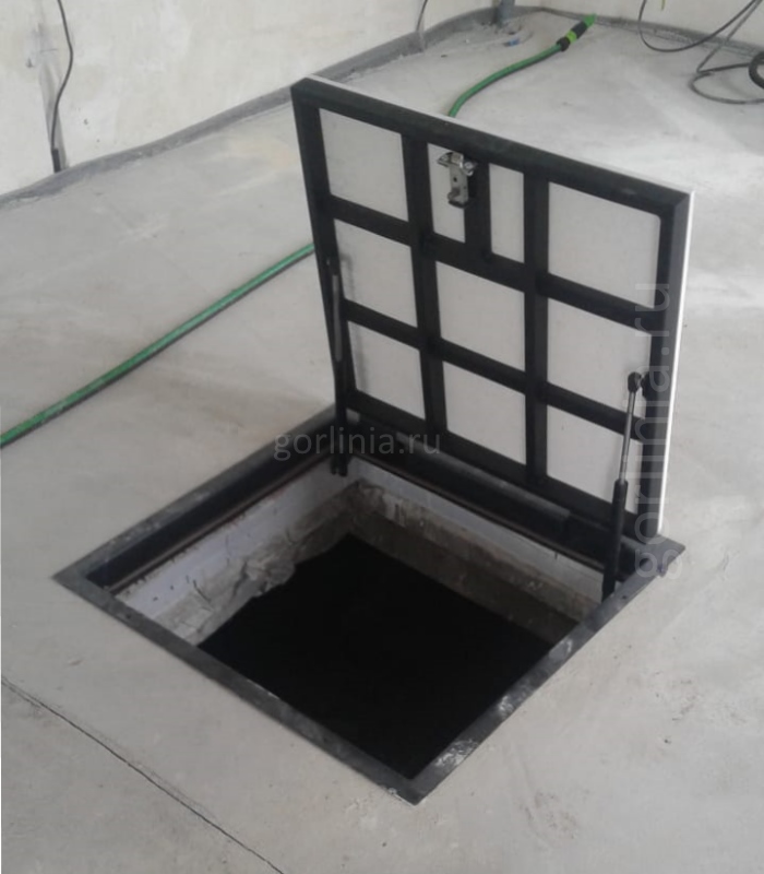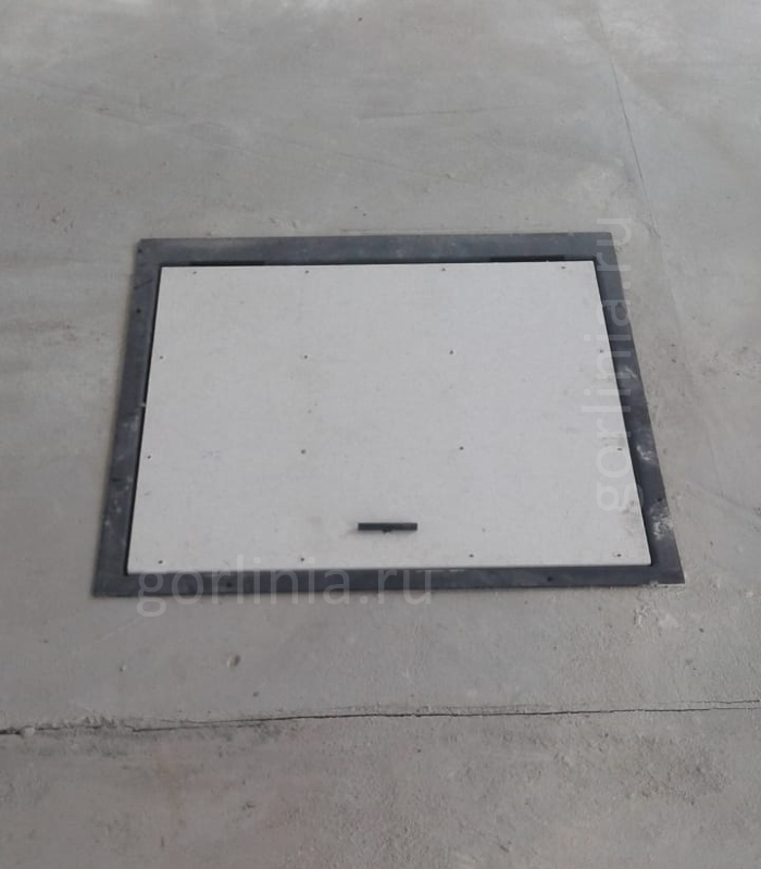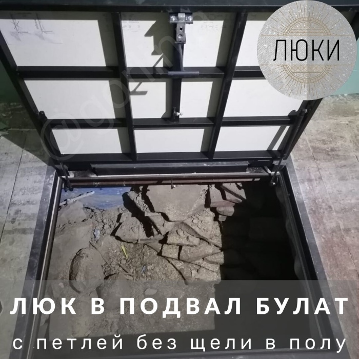 Люк напольный с замкнутым периметром. Конструкция смещенного за ось шарнирного соединения образует опорные поверхности в четверти по всем четырем сторонам, закрывает щель в полу под петлями, сохраняет размер проема в чистоте 1050х600.