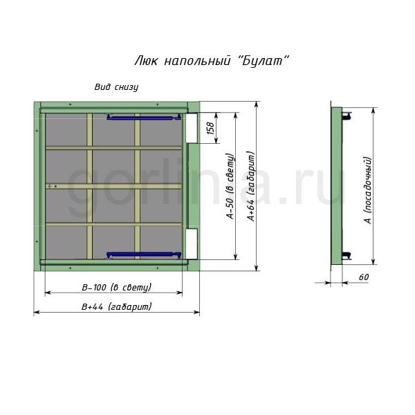 Продуманная схема скрытой установки посадочной части коробки 1200х700 в подготовленное посадочное отверстие в нулевую отметку пола. Облицовка примыкающего по периметру стального обрамления и ГВЛ полотна керамогранитом, плиткой (настил ламината) с эффектом невидимки.