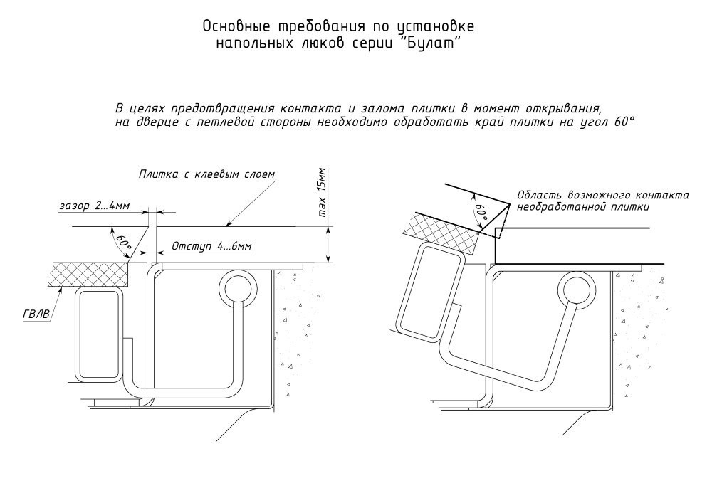 Облегченная модель без щелей в полу со смещенными за ось открывания петлями. Петлевая сторона по меньшему размеру 500 с плечевой 600 образует удобный лаз 450*500. Легкая ходовая часть и удобный монтаж. При формировании напольного отверстия обратите внимание на защитные кожухи шарниров. Коробки выходят за посадочную отметку по плечевой стороне.