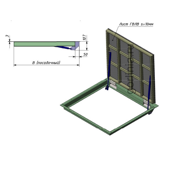 Плотный притвор без щелей в полу со смещенными за ось открывания петлями через вырезанные в раме ниши. Легкая ходовая часть на амортизаторах и удобный монтаж с облицовкой крышки керамическим или ламинированным покрытием.